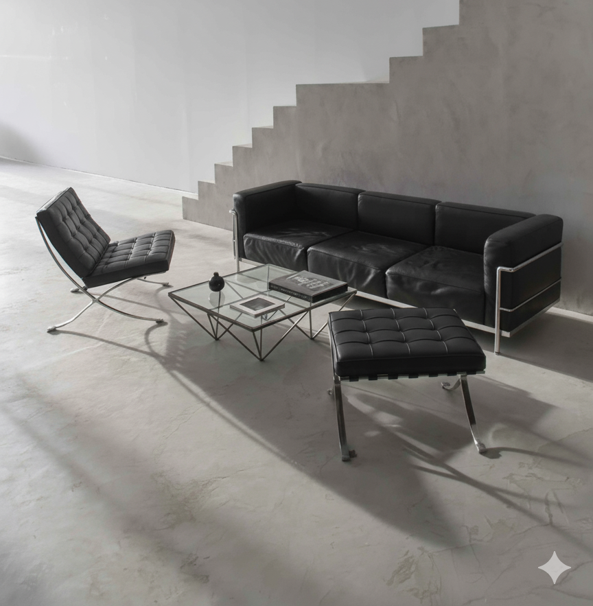 The LC3 sofa presents its cage-like frame externally from an architectural perspective, with cushions nestled within the structure. It seamlessly blends metal and leather, embodying minimalist beauty. The soft sofa cushions create an alluring sense of relaxation and envelopment.