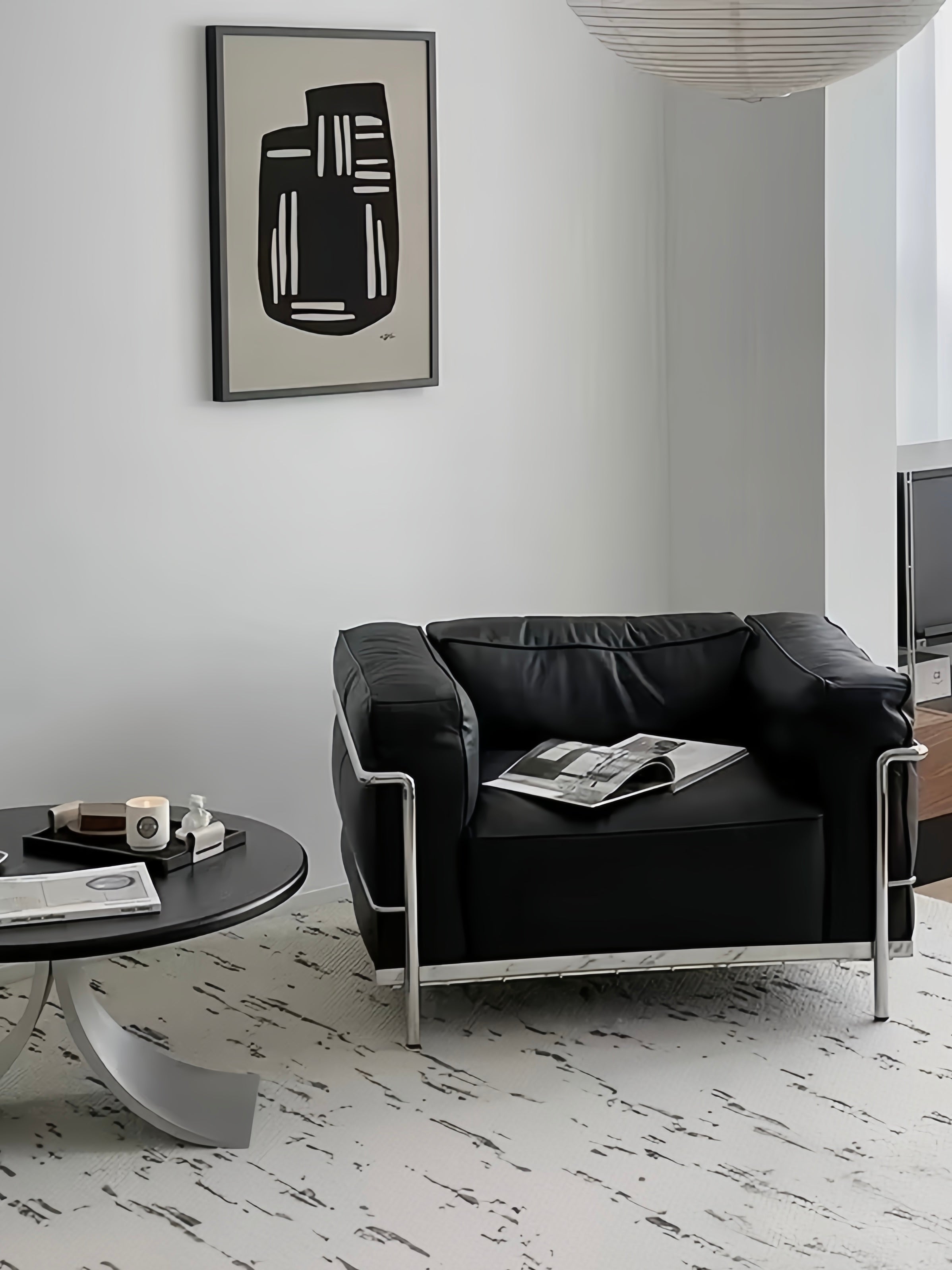 The LC3 sofa presents its cage-like frame externally from an architectural perspective, with cushions nestled within the structure. It seamlessly blends metal and leather, embodying minimalist beauty. The soft sofa cushions create an alluring sense of relaxation and envelopment.