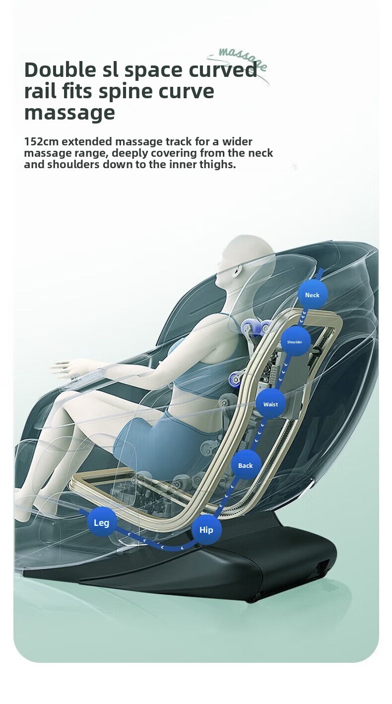 - Dual SL Track & Extended 152cm Coverage — Massage range follows spine curve from neck to upper thighs for deep tissue relaxation.