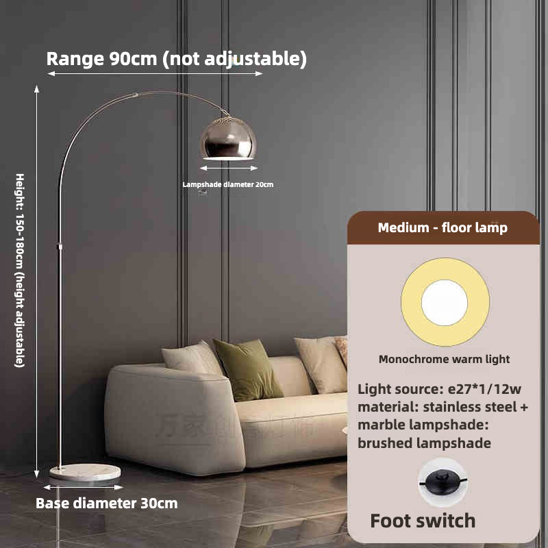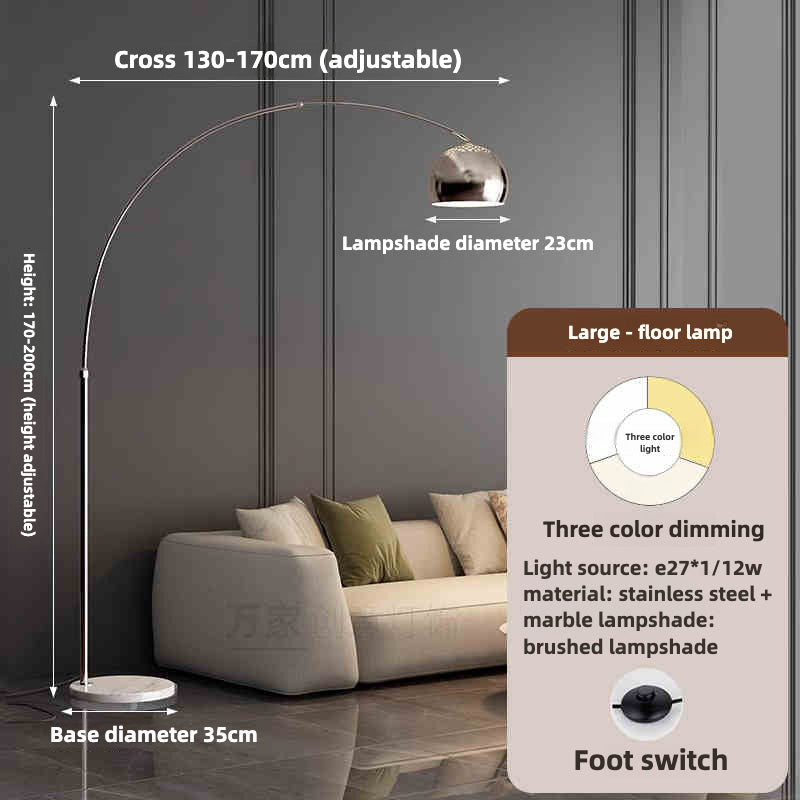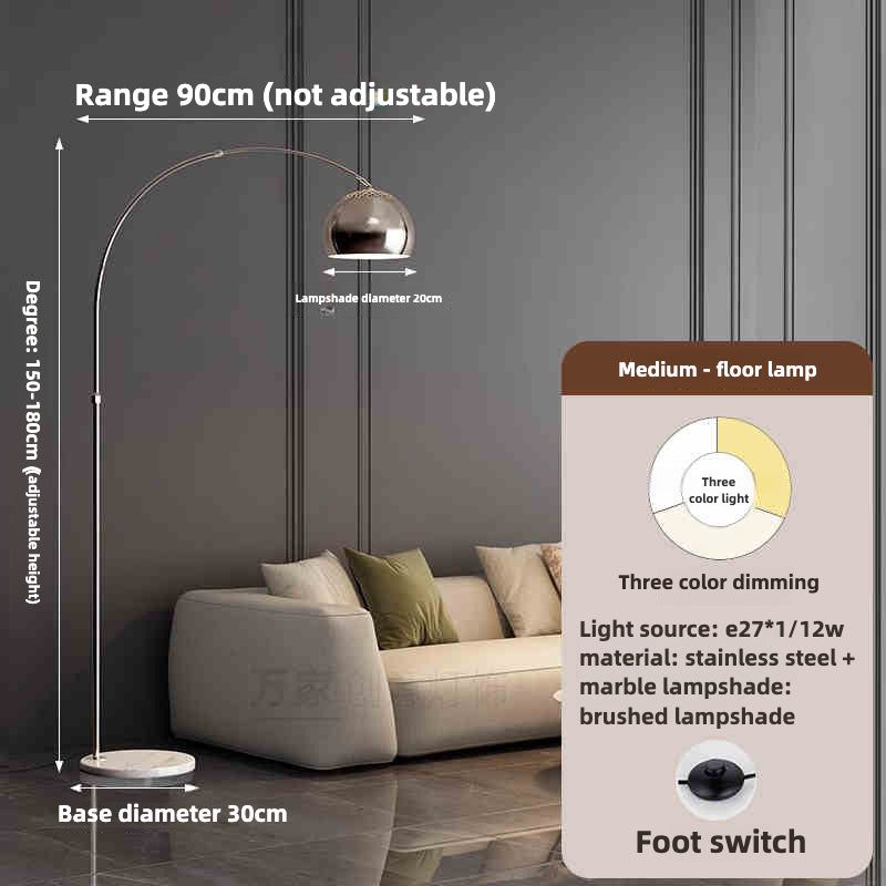 Crafted with a polished stainless steel lampshade and a heavy-duty marble base, this high-quality arc floor lamp ensures both durability and visual appeal. The reflective metal shade provides a soft, focused glow, while the adjustable arc arm allows you to customize the lighting direction to suit your space and activity. This lamp is ideal for those seeking an adjustable floor lamp, metal floor lamp, or sturdy standing lamp that fits seamlessly into modern interiors.