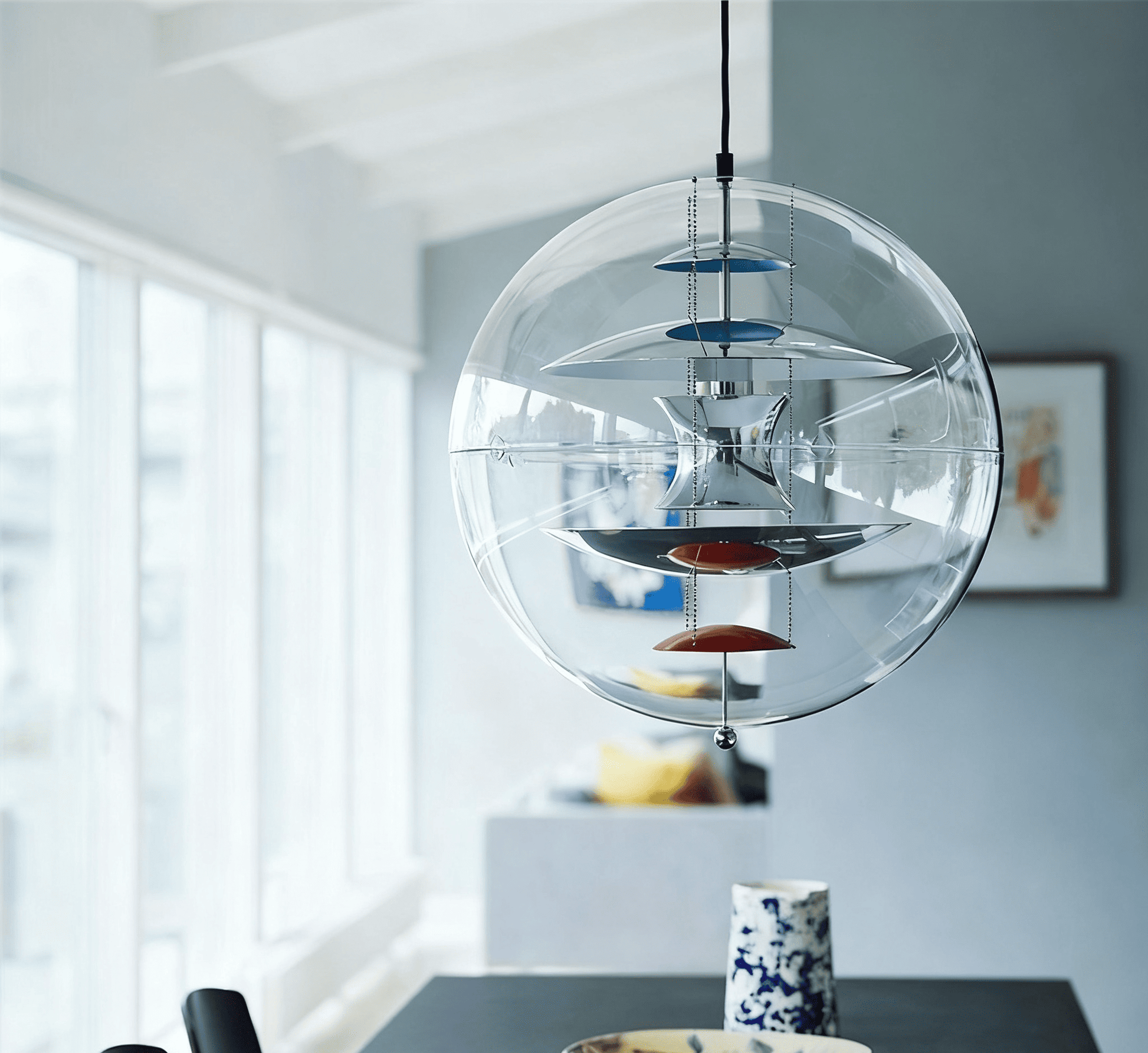 The VP Globe is a classic masterpiece by Danish design legend Verner Panton. Its transparent acrylic sphere and internally suspended metal reflector create a futuristic, spaceship-like aesthetic. It serves as both a soft ambient light source and a collectible-grade artwork that elevates any space.